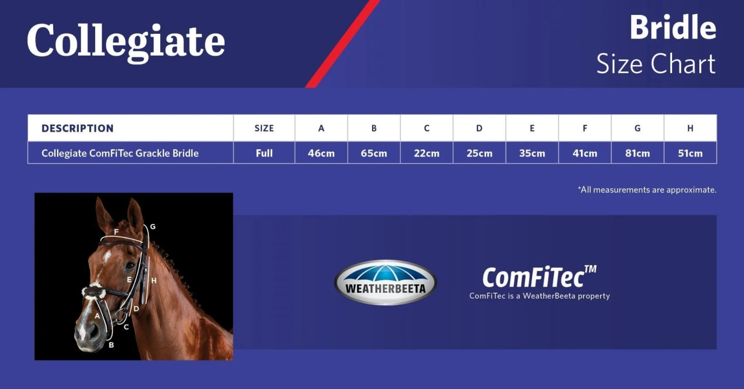 The Collegiate Comfitec Grackle Bridle is made from high quality European leather. The anatomical headpiece features super soft padding throughout and is wider shaped between the horses ears to distribute pressure evenly and comfortably. Featuring padding on the nose piece for added comfort. The fleece across the nose is removable for easy washing.