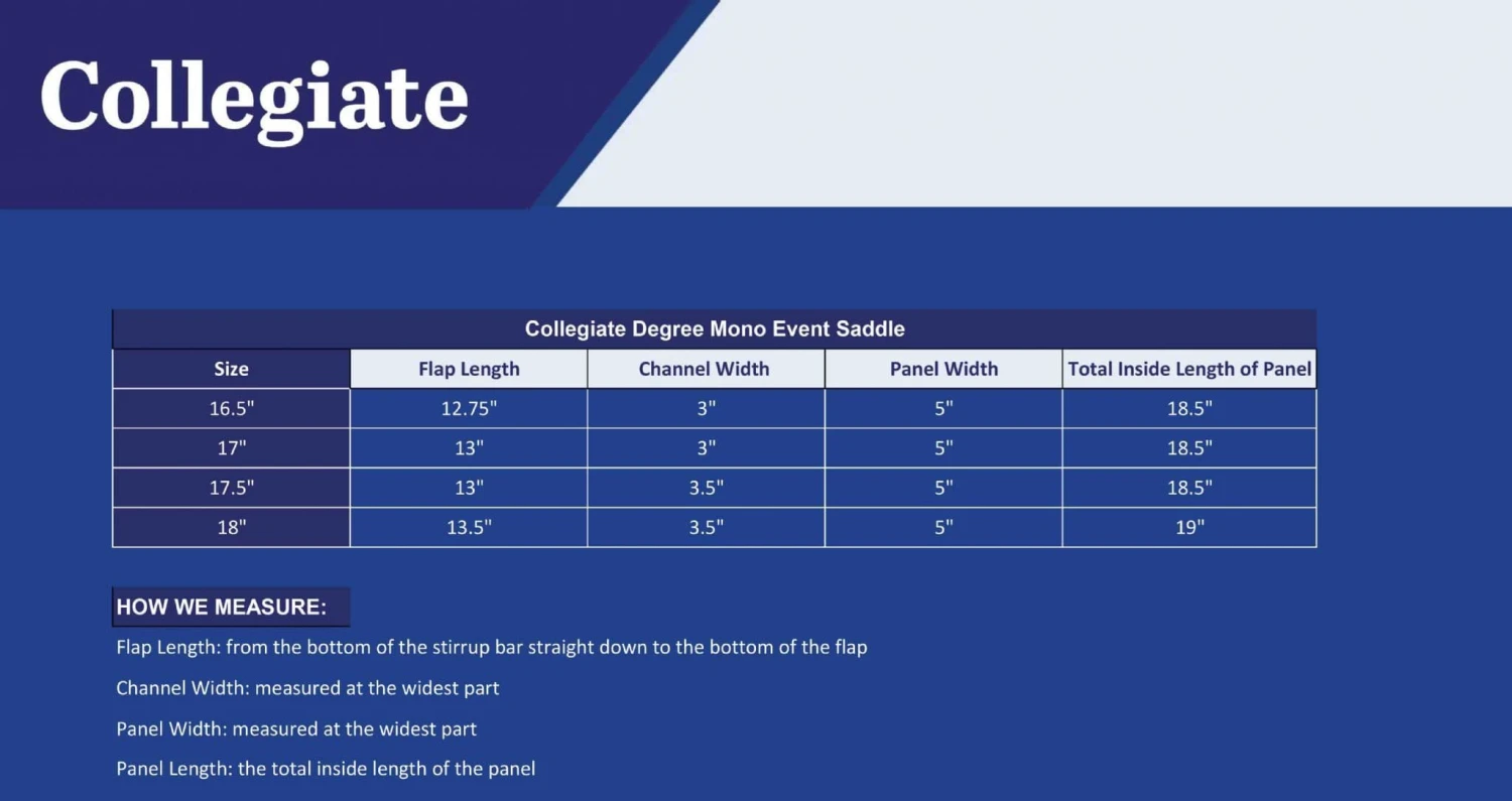 The Collegiate Degree Mono Event Saddle is a jump saddle featuring a monoflap design which puts the rider closer to the horse for ultimate close contact. This saddle also includes long front gussets, surface blocks, square cantle, contrast stitching, and a leather wear patch. As your horses level of fitness and shape changes, the simple & quick changeable gullet allows you to alter the width of your saddle to custom fit your horse. This Collegiate model is compatible with the Opti-Fit Series III gullets. *Please be aware, saddles featuring a colored gullet inside, are compatible with the Collegiate Series III Gullets.