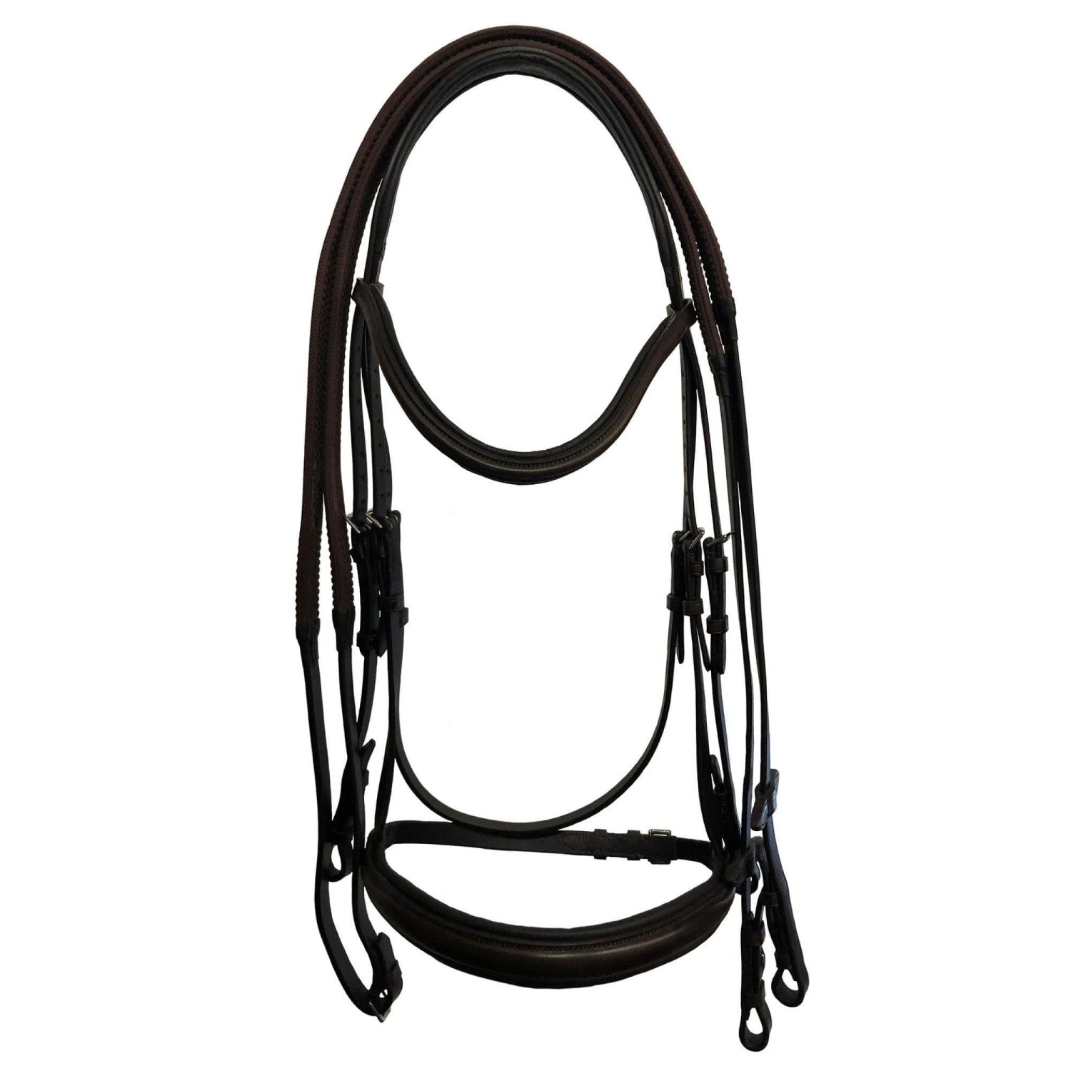 Stylish raised Cavesson bridle with softly padded ergonomic headpiece. Made from the finest quality European leather with highly polished stainless steel fittings. Also comes with rubber reins.