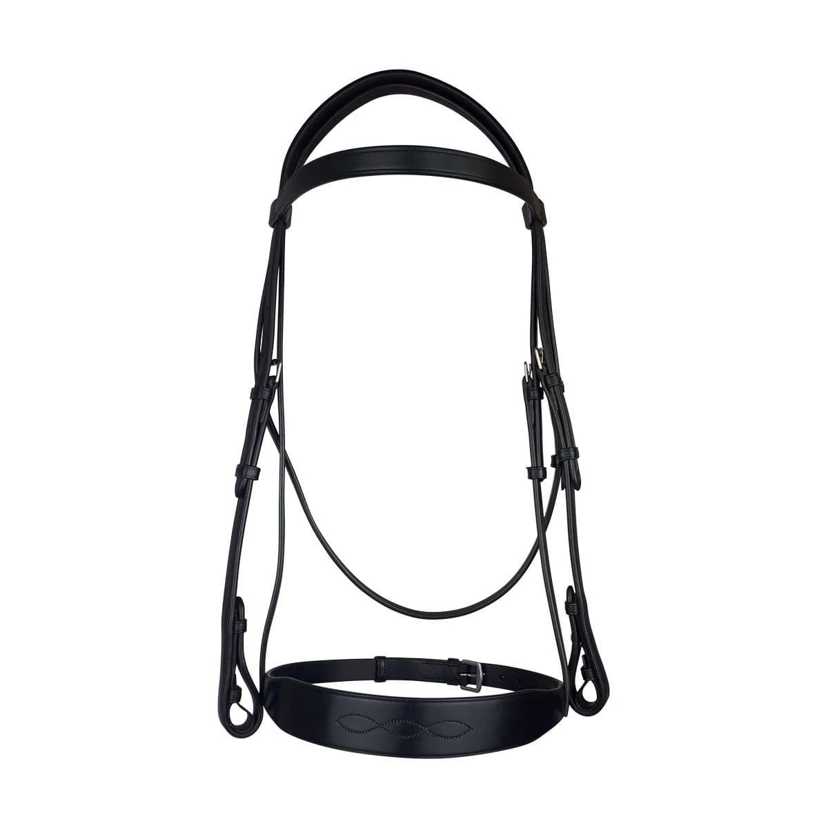 Our Show bridle is beautiful in its balanced simplicity allowing the luxurious eco leather and skilled craftsmanship to speak for itself.Made to a classic traditional design with a broad noseband with matching stitching detail and plain browband this bridle is fit to grace any show ring,PRODUCT DETAILSFeatures include adjustable cheekpieces and secure hook & eye fastenings for a tailored, comfortable fit.