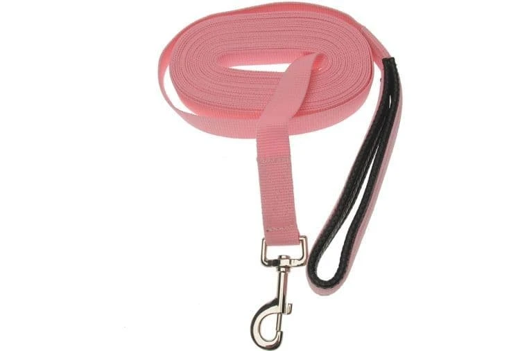 A soft cotton webbing lunge rein with a touch grip handle and clip attachment.