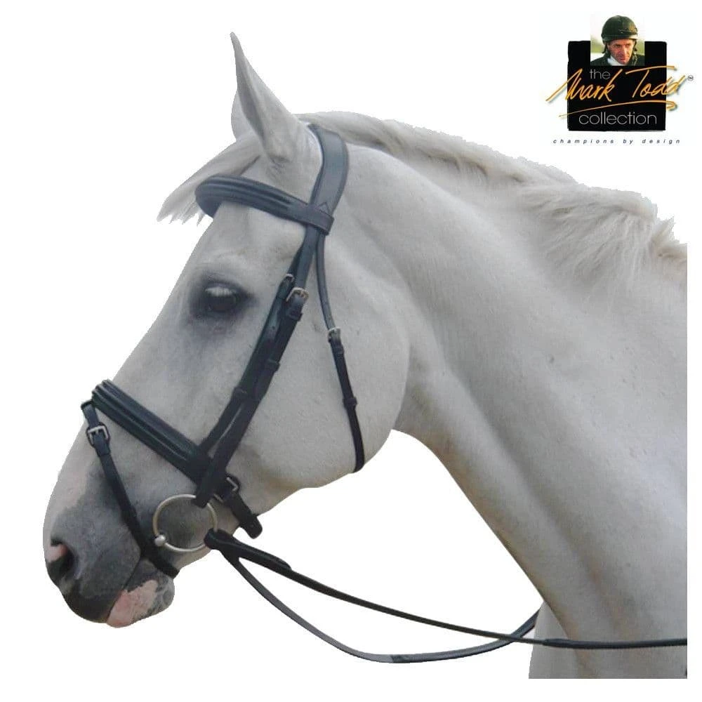 The Mark Todd Double Raised Bridle. Features: Quality Leather Bridle, Squared Stainless Steel Buckles, Complete with Rubber Reins, Double Raised padded crank noseband, Flash Strap, Matching double raised browband, Shaped padded headpiece, Mark Todd Signature stamp