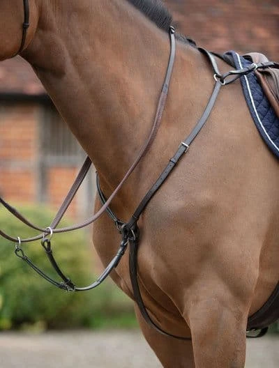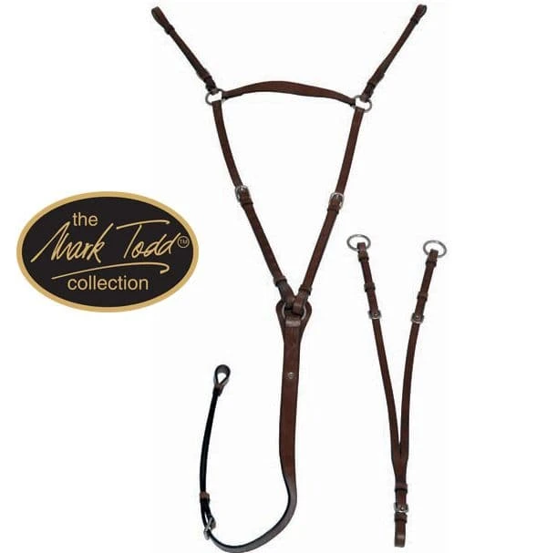 This Mark Todd Hunting Breastplate is a high-quality English leather breastplate with stainless steel fittings and adjustable martingale attachment that achors on the D-rings of the saddle over the top as opposed to other breastplates that come around the chest area to fit onto the girth.