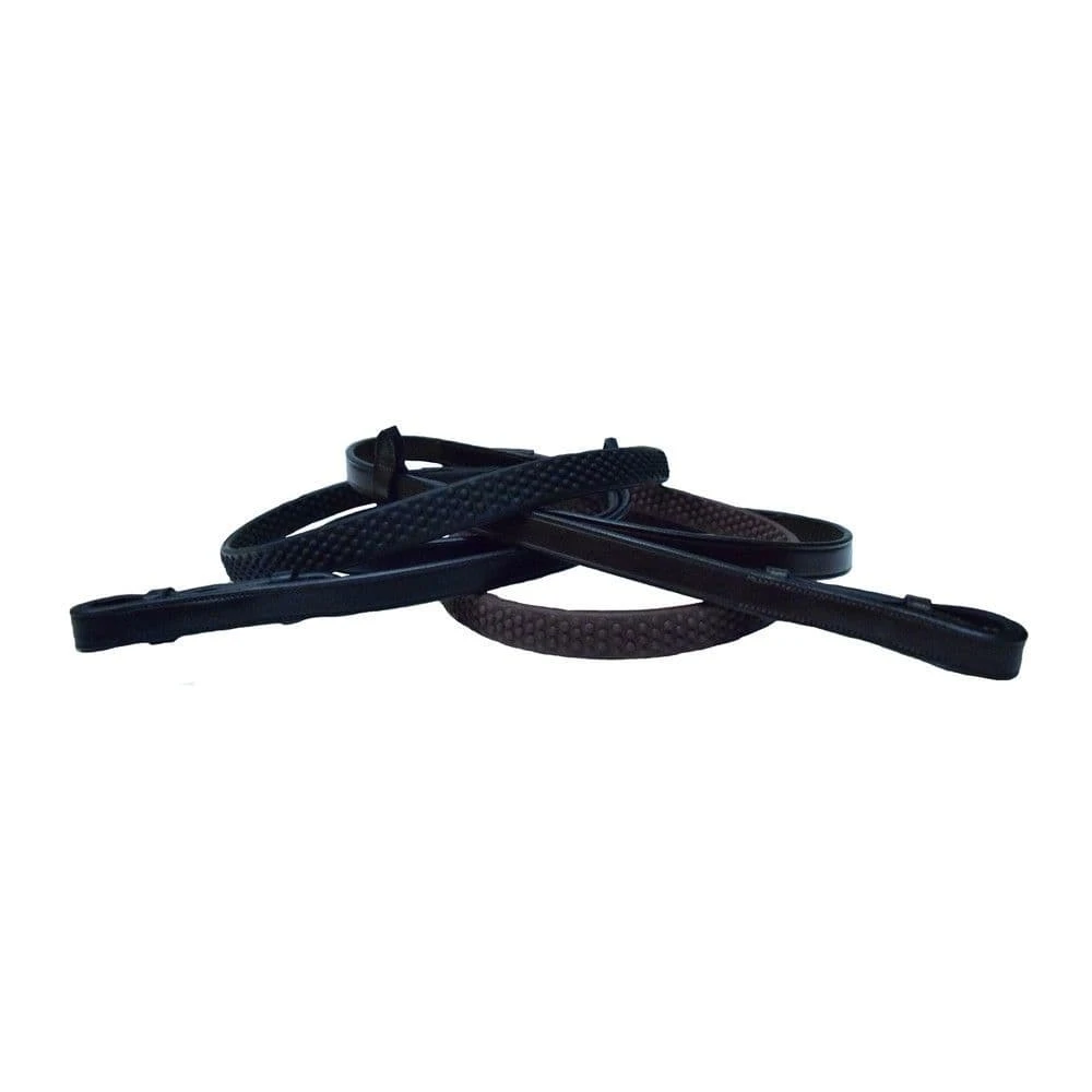 The Mark Todd Soft Hold Rubber Reins are supple and help keep purchase and tension, even in wet conditions. These rubber reins can be paired beautifully with any bridle from Mark Todd. The Mark Todd reins feature a round raised rubber surface to aid in grip and billet fastenings.