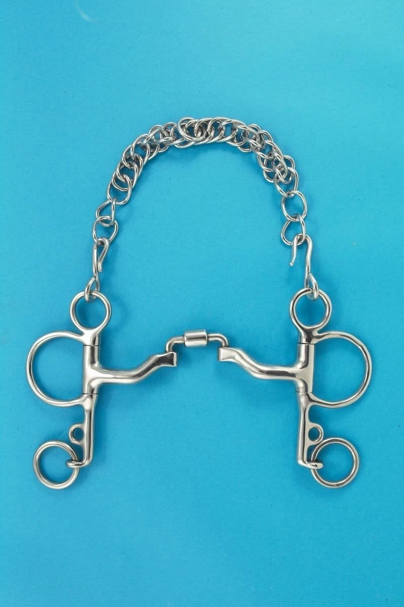 This is a curved mouthpiece with an upward and forward bend, two hinges and centre piece with barrel for Independent Side Movement. There’s no restriction in degree of collapse. This offers lots of tongue relief to the compliant horse but will put downward pressure on top of bars when activated, followed by downward pressure on tongue and inward collapse on bars. This can also work well for the strong horse with head down low or into chest. Encourages horse up into bridle.