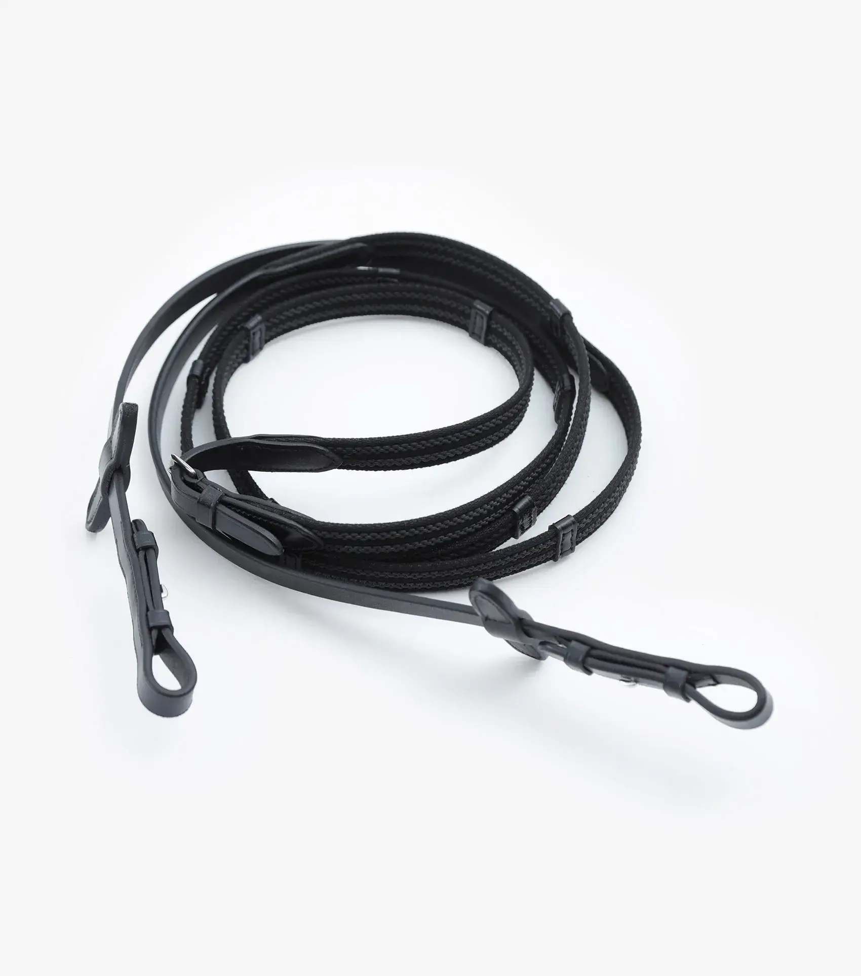 Finished with leather martingale stoppers and stainless steel billet fastenings, these reins are ideal for those who need a strong grip without compromising on flexibility. The perfect choice for many equestrian disciplines.