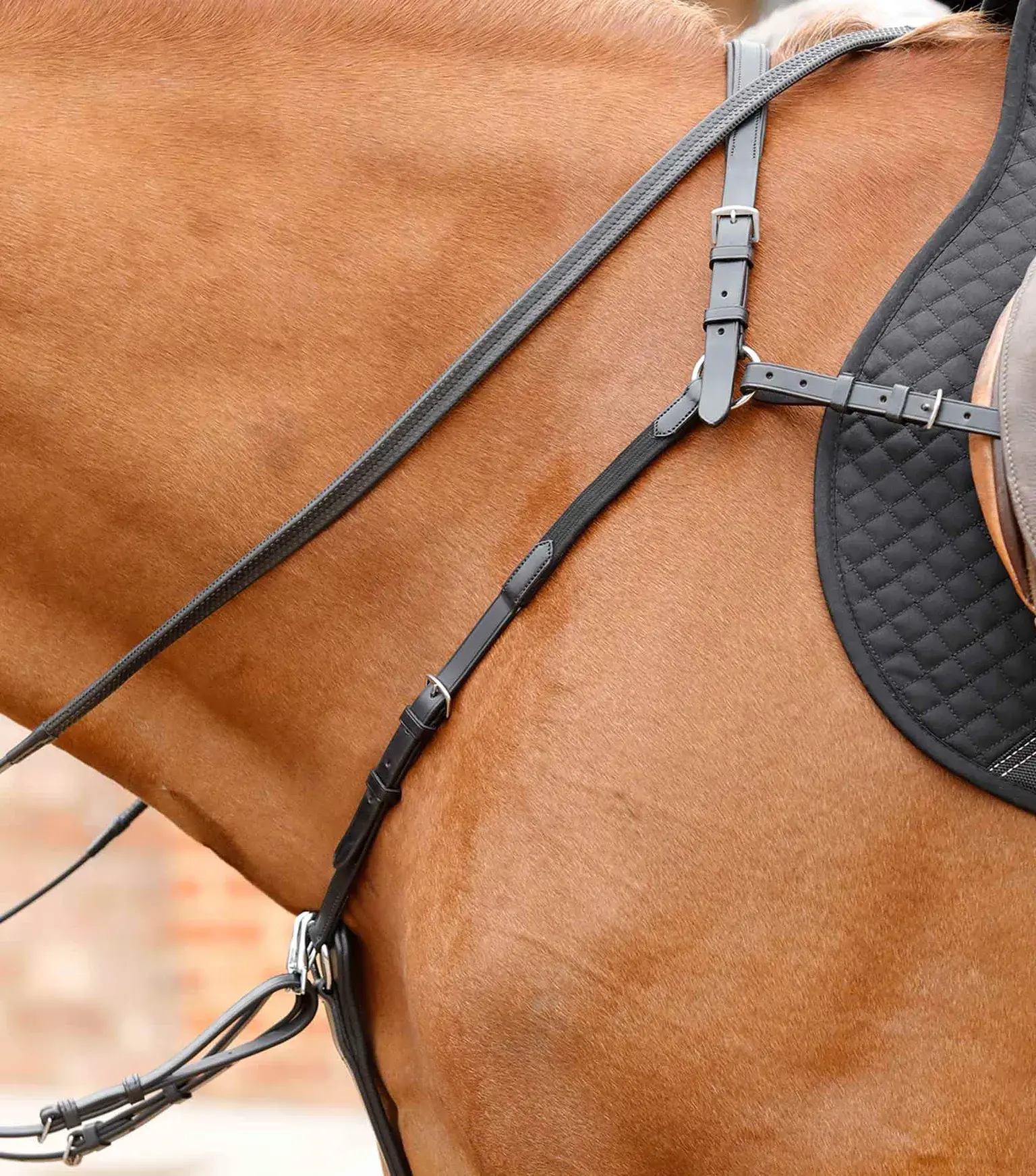 This breastplate is fitted through the girth straps (underneath the saddle flap) on either side as well as to the girth itself between the legs. Easily adjusted at the wither, shoulder and girth so that you can optimise the fit to suit your horse’s individual needs. Removable running martingale/neck straps can be used to help keep your horse’s head at a controllable height. Top quality stainless steel buckles, clips and fixtures give this performance breastplate a professional finish, perfect for everyday or competition use.